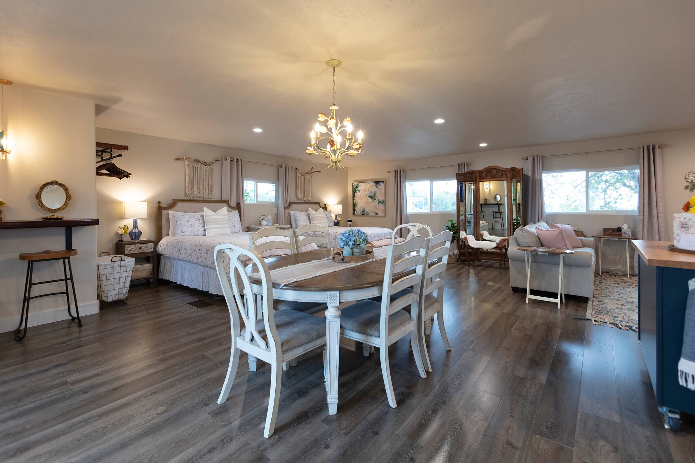 Perched at the highest point of L-J Ranch, overlooking the Pine River Valley, The Loft serves as both the private bridal suite for LePlatt’s Pond weddings and a beloved year-round guest retreat. Included as a two-night stay for wedding couples and reserved between celebrations by travelers visiting Bayfield and Durango, it offers open-concept living, sweeping ranch views, and a spacious private deck — a place to gather, unwind, and settle into the quiet rhythm of a true Colorado ranch.